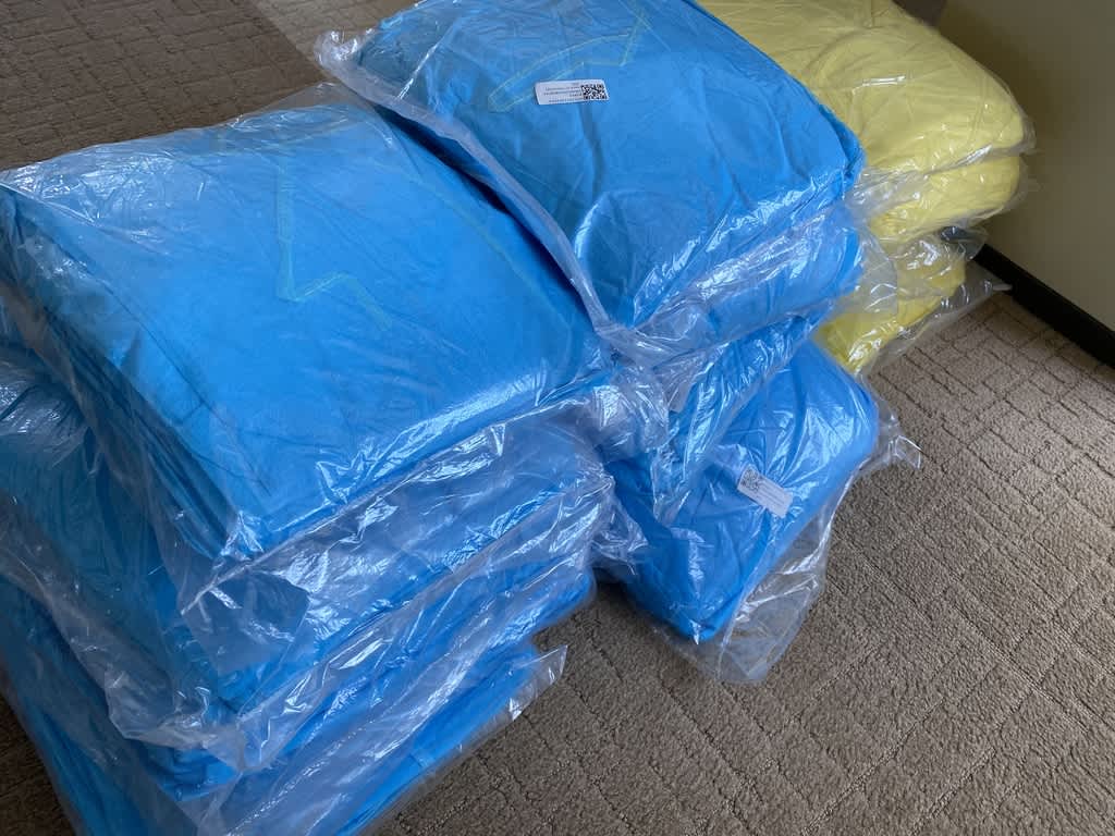 5月末にやっと入荷した防護服を尼崎医療センターへ送付。